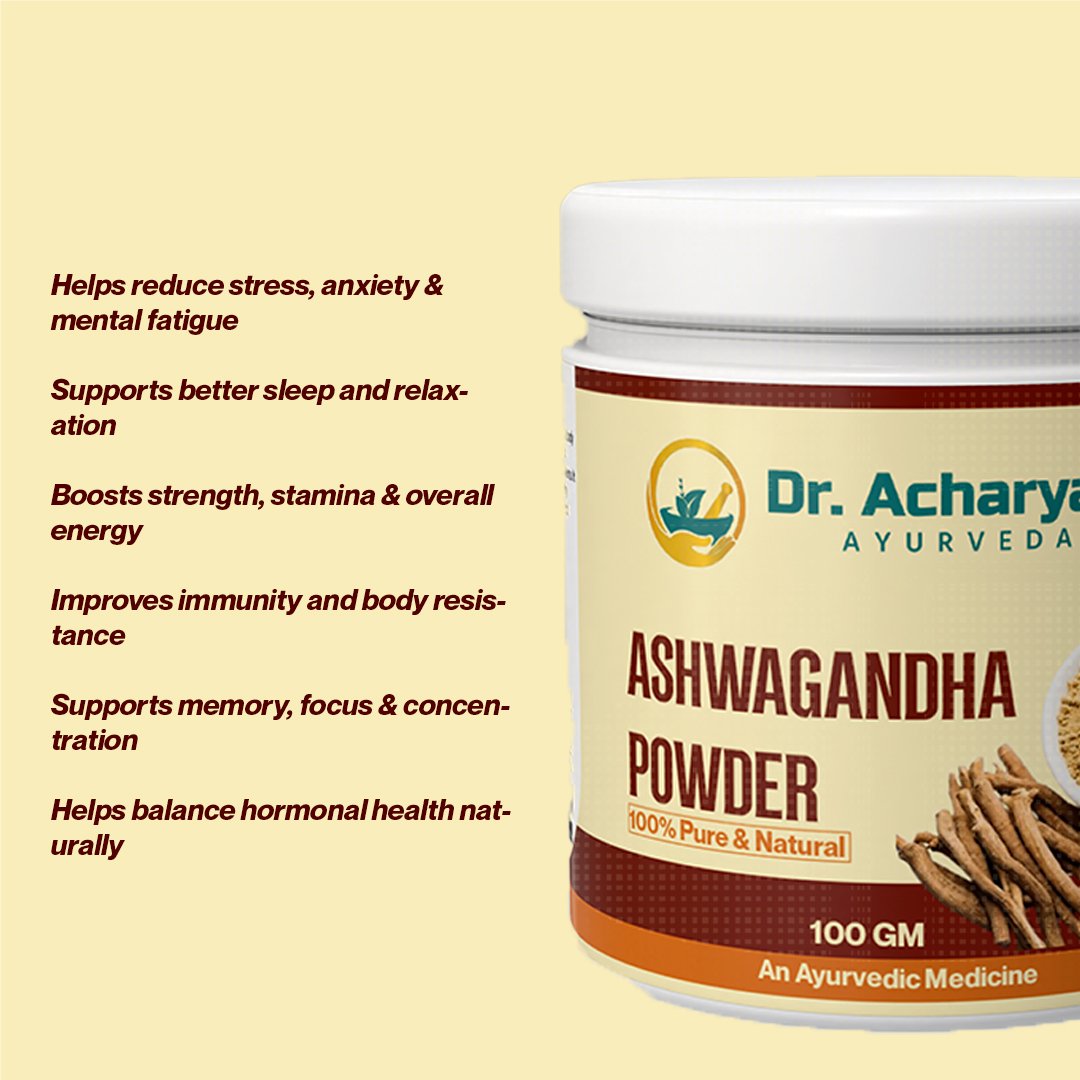 Ashwagandha Powder by Dr. Acharya’s Ayurveda is made from carefully selected and finely processed Ashwagandha roots, a powerful adaptogenic herb widely used in traditional Ayurveda. This 100% pure and natural herbal powder is designed to support strength, stamina, stress management, and overall vitality.
