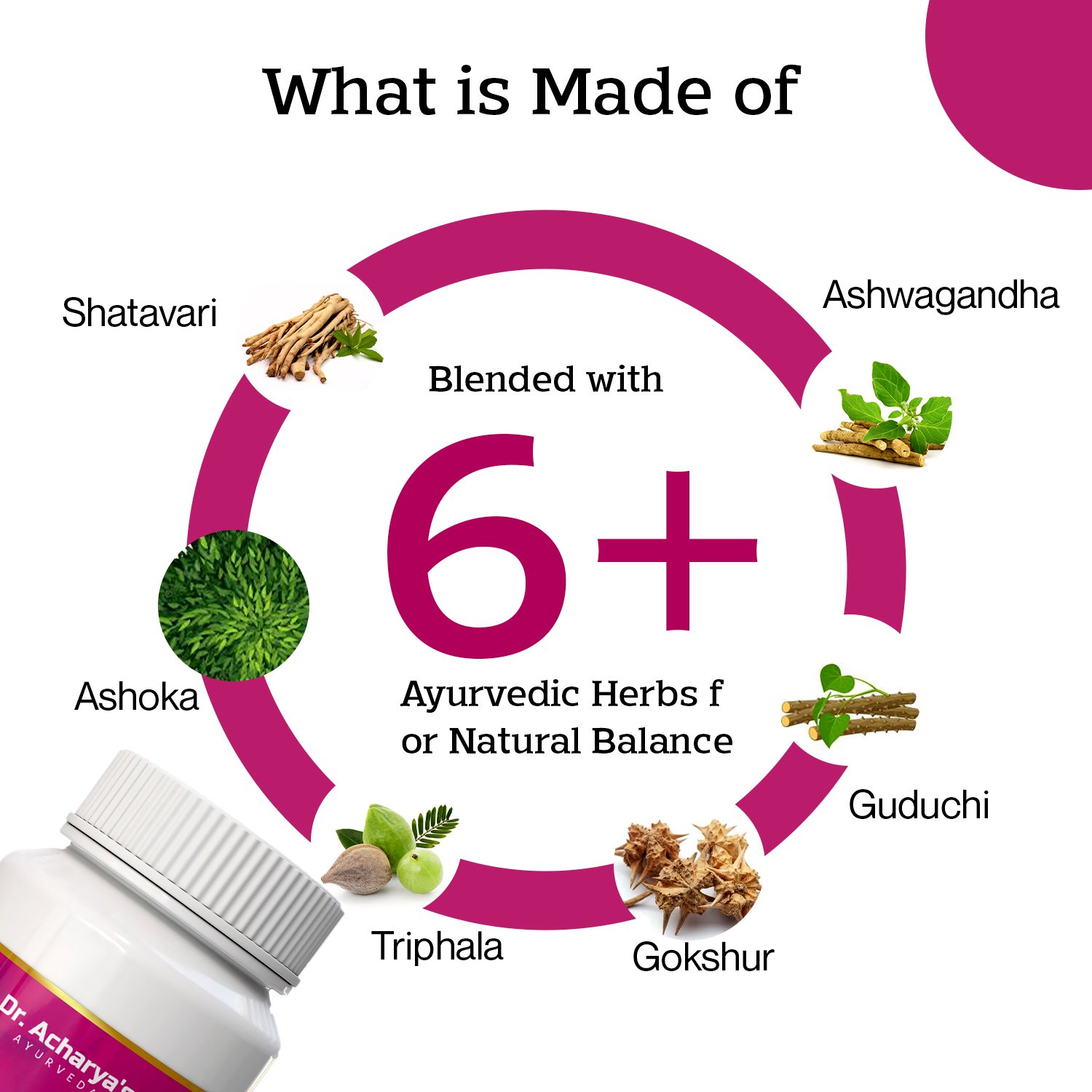 Shatavari, Varuna, Ashoka, Triphala, Gokshur, Guduchi, Suddha Phitkari, Loha Bhasma, Ashwagandha
