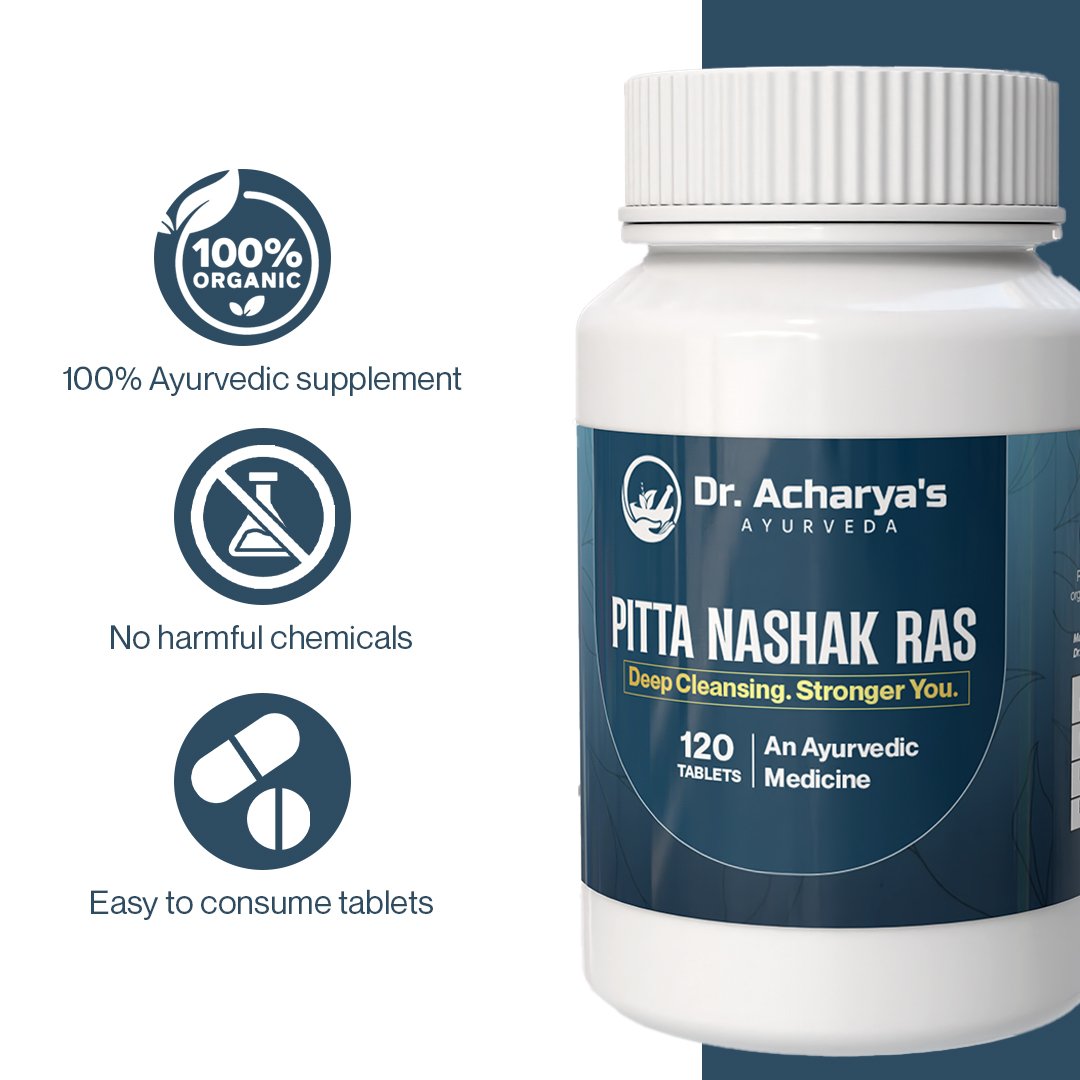 Pitta Nashak Ras by Dr. Acharya’s Ayurveda is a traditional Ayurvedic formulation designed to help maintain Pitta balance in the body. According to Ayurveda, excess Pitta may lead to heat-related discomfort, acidity, skin sensitivity, and digestive imbalance.