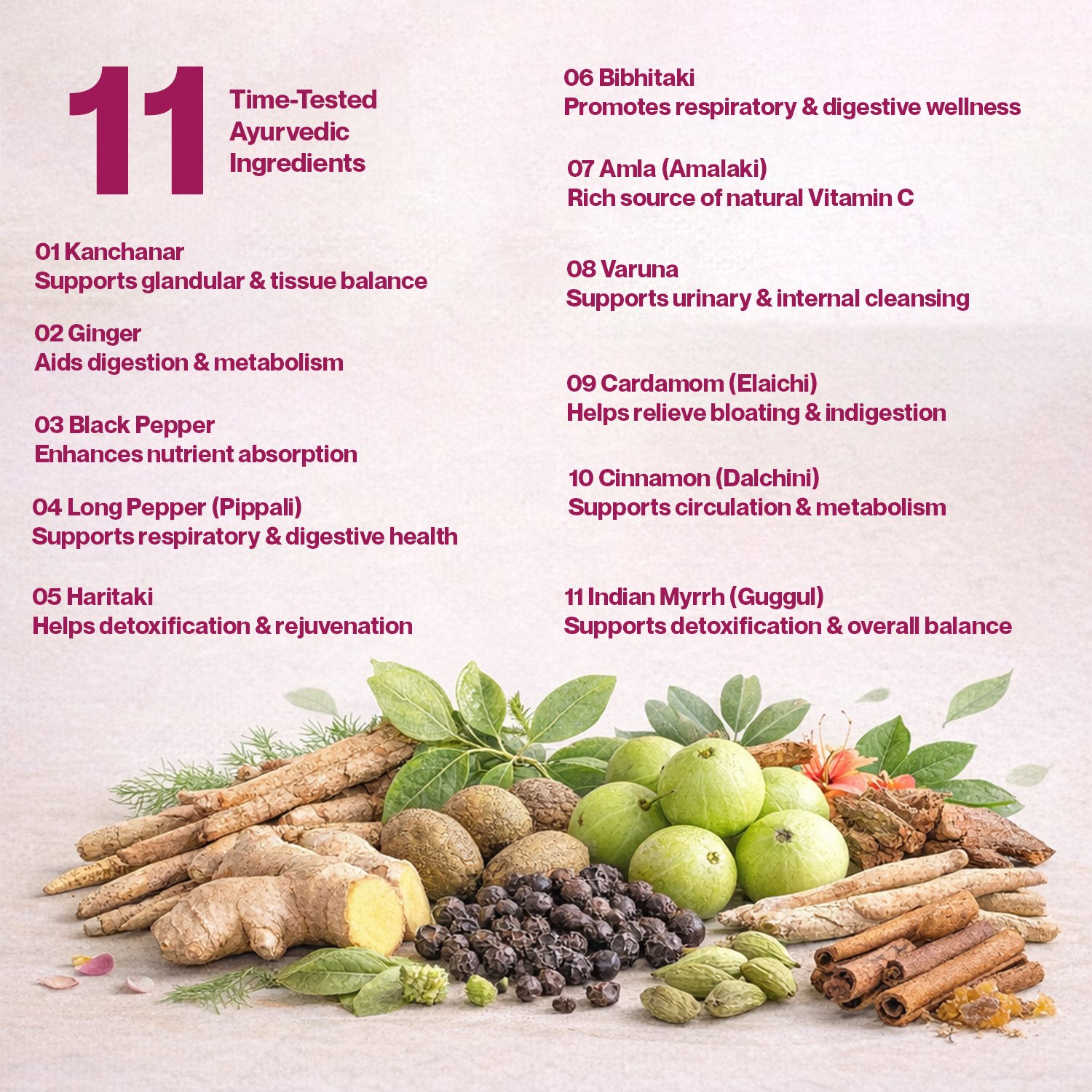 Kanchanar Bark, Ginger, Black Pepper, Long Pepper, Haritaki, Bibhitaki, Amlaki, Varuna, Cardamom, Cinnamon, Indian Myrrh
