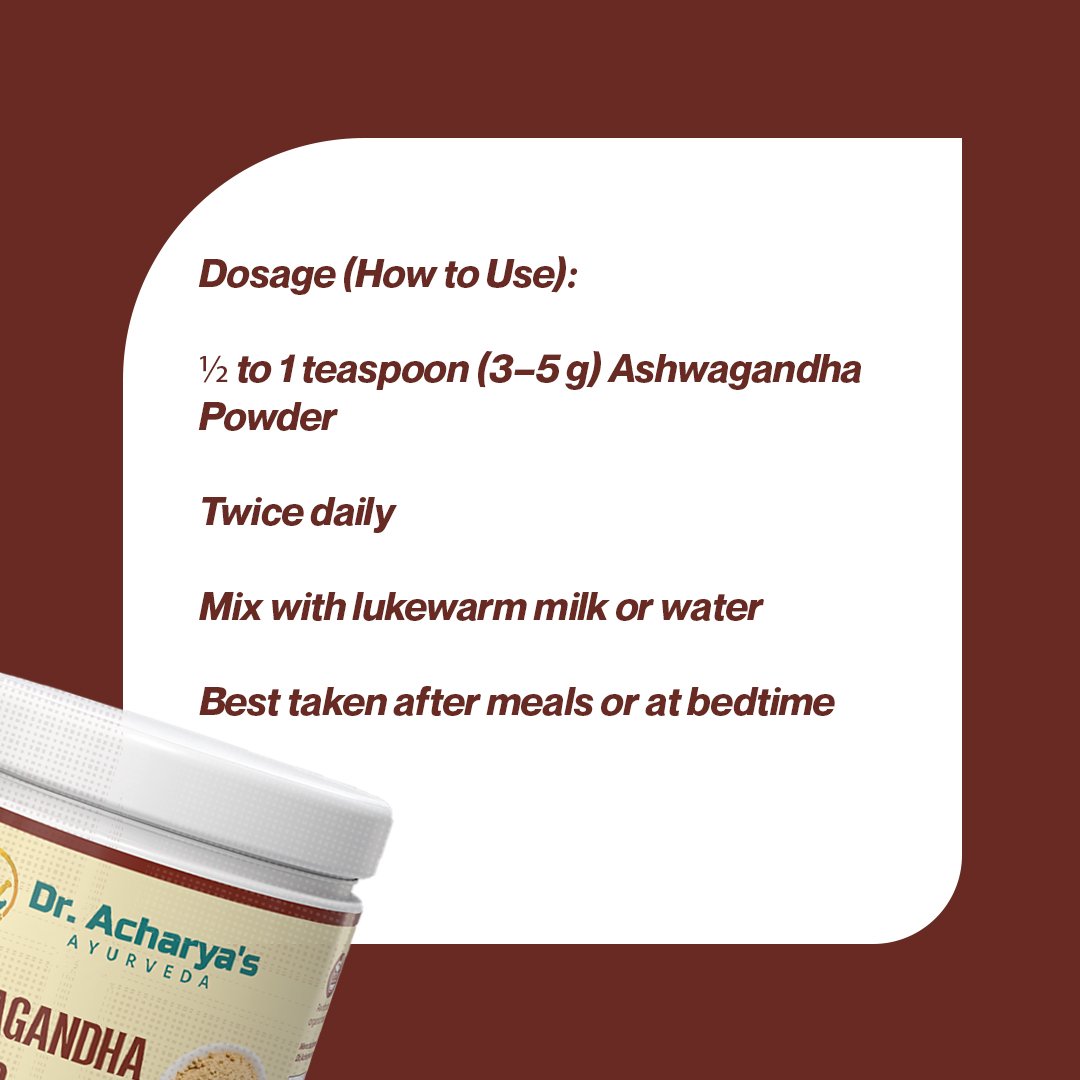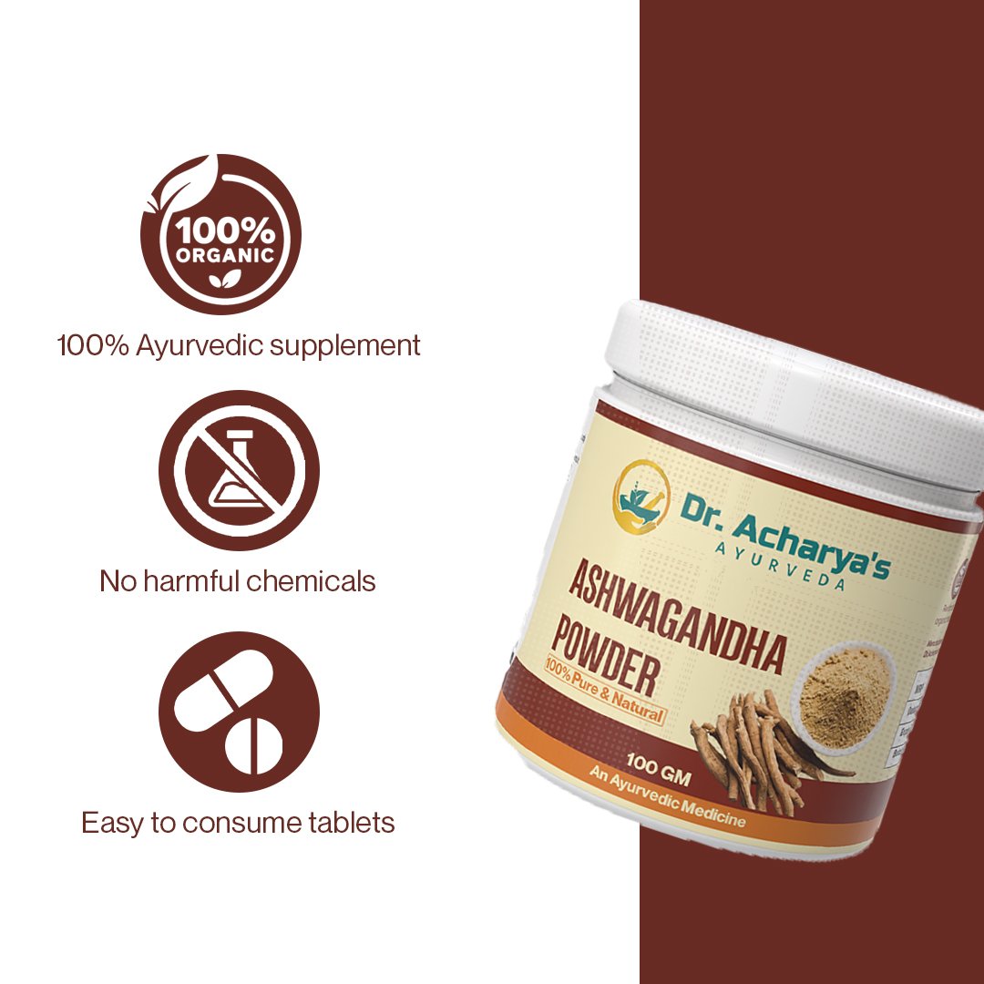 Ashwagandha Powder by Dr. Acharya’s Ayurveda is made from carefully selected and finely processed Ashwagandha roots, a powerful adaptogenic herb widely used in traditional Ayurveda. This 100% pure and natural herbal powder is designed to support strength, stamina, stress management, and overall vitality.