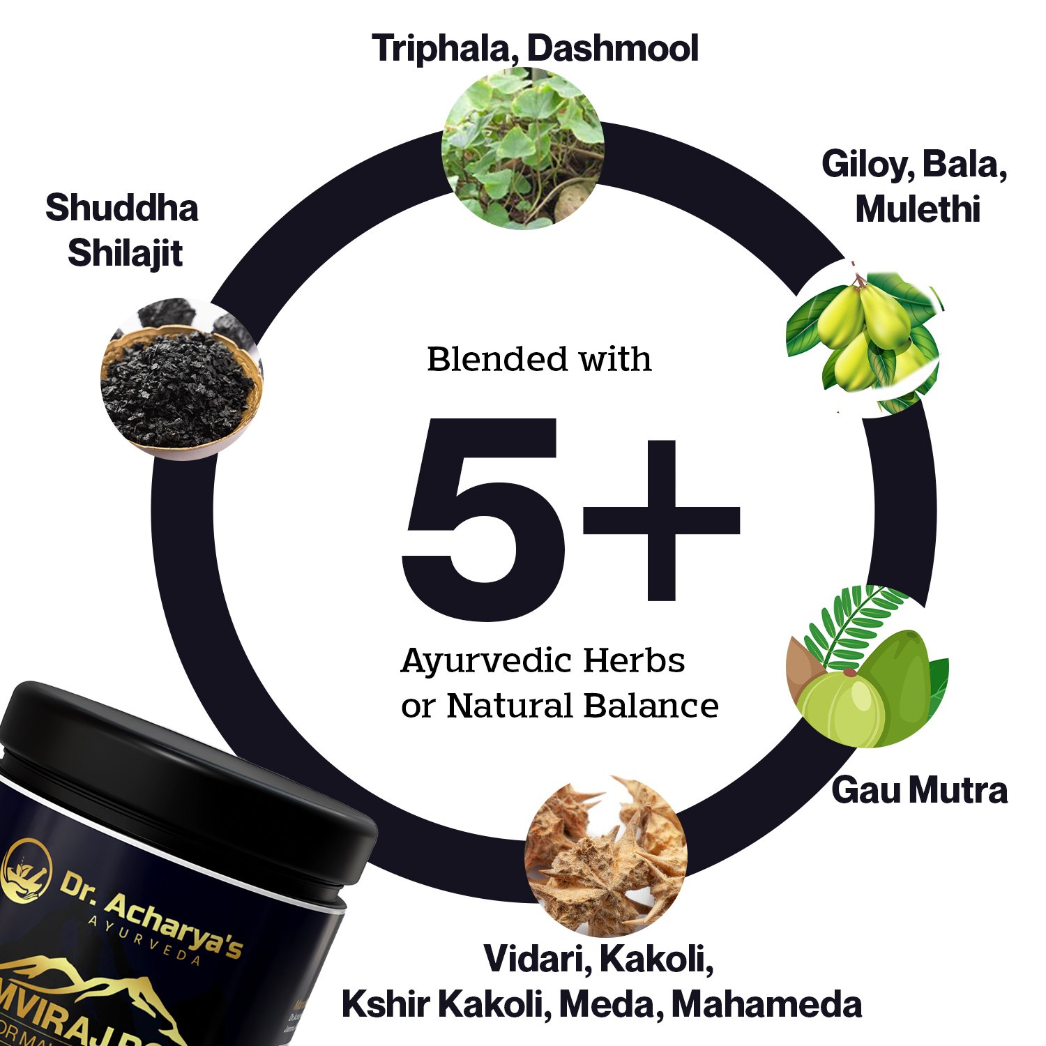 Kaunch (Mucuna pruriens), Safed Musli (Asparagus adscendens), Talmakhana (Hygrophila spinosa), Mishri (Sugar), Shilajit (Asphaltum Punjabianum)